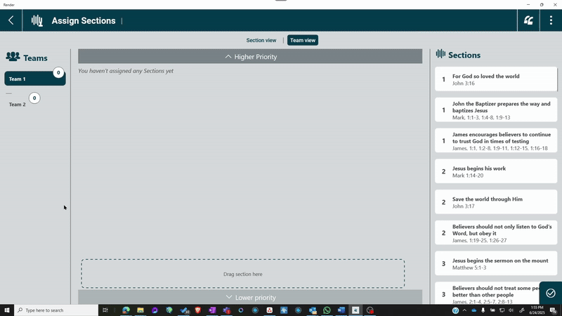 To assign sections in this view - drag the team you want to assign to section from the right-side panel and place it on the 'Drag team here' box of the desired section.