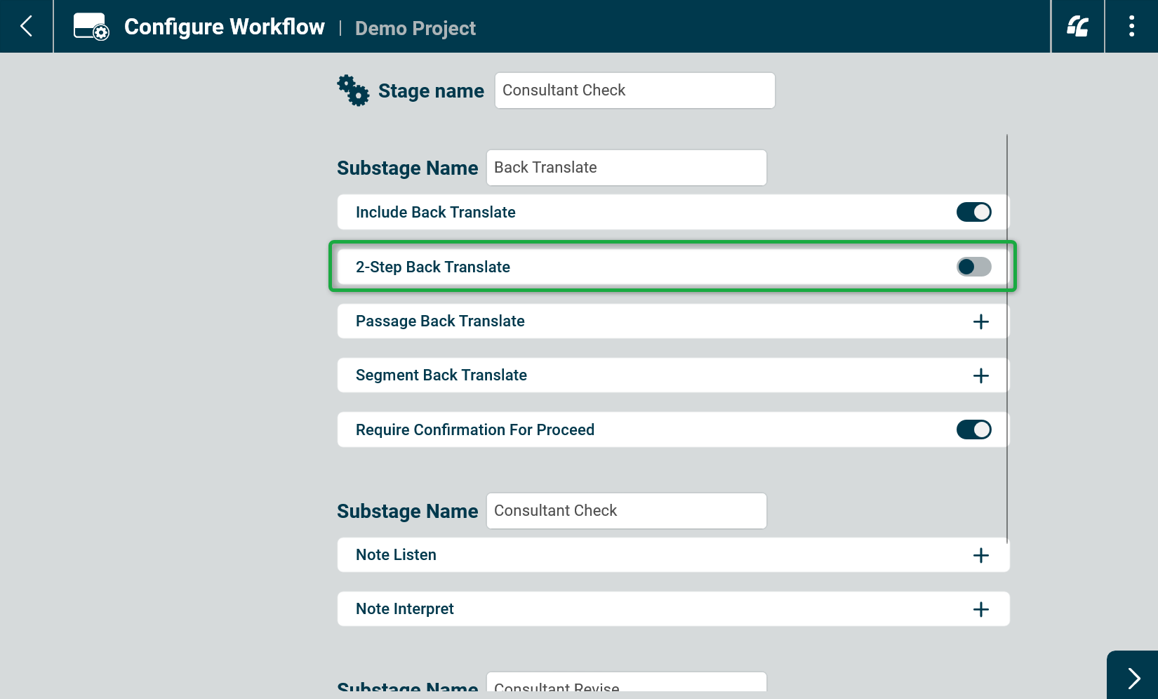 Enabling Two Step Back Translation is found in the Workflow Configuration, Consultant Check stage settings.
