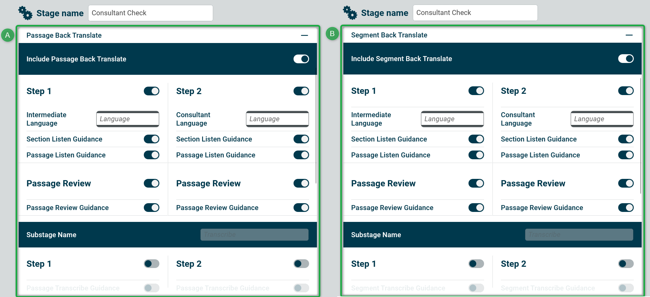 Within the Passage and Segment settings users can turn on/off guidance, Passage/Section Review pages and enable Transcribe on the Passage and/or Segment level.