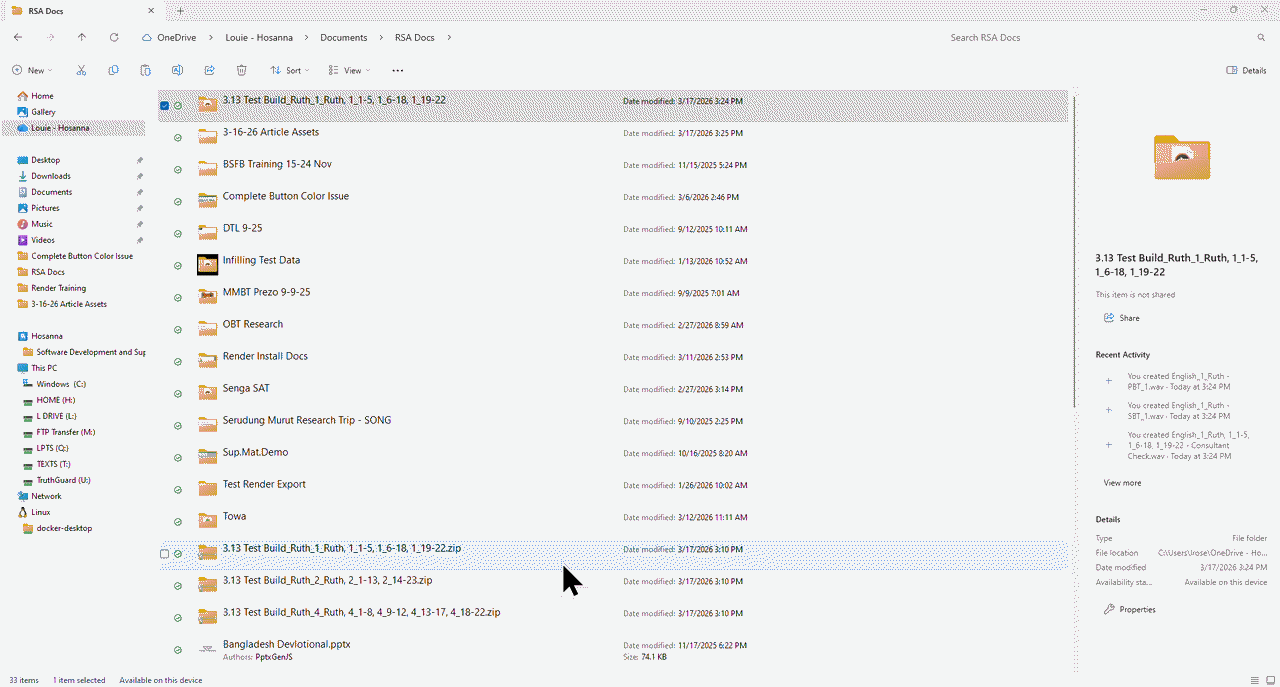 - A Windows Explorer window will appear. Choose the destination location on your computer and then click on the "Select Folder" button. This will create a separate zipped file at that location for each of the sections you checked. Each zip file will contain all the draft and back translation audio associated with that Section.
