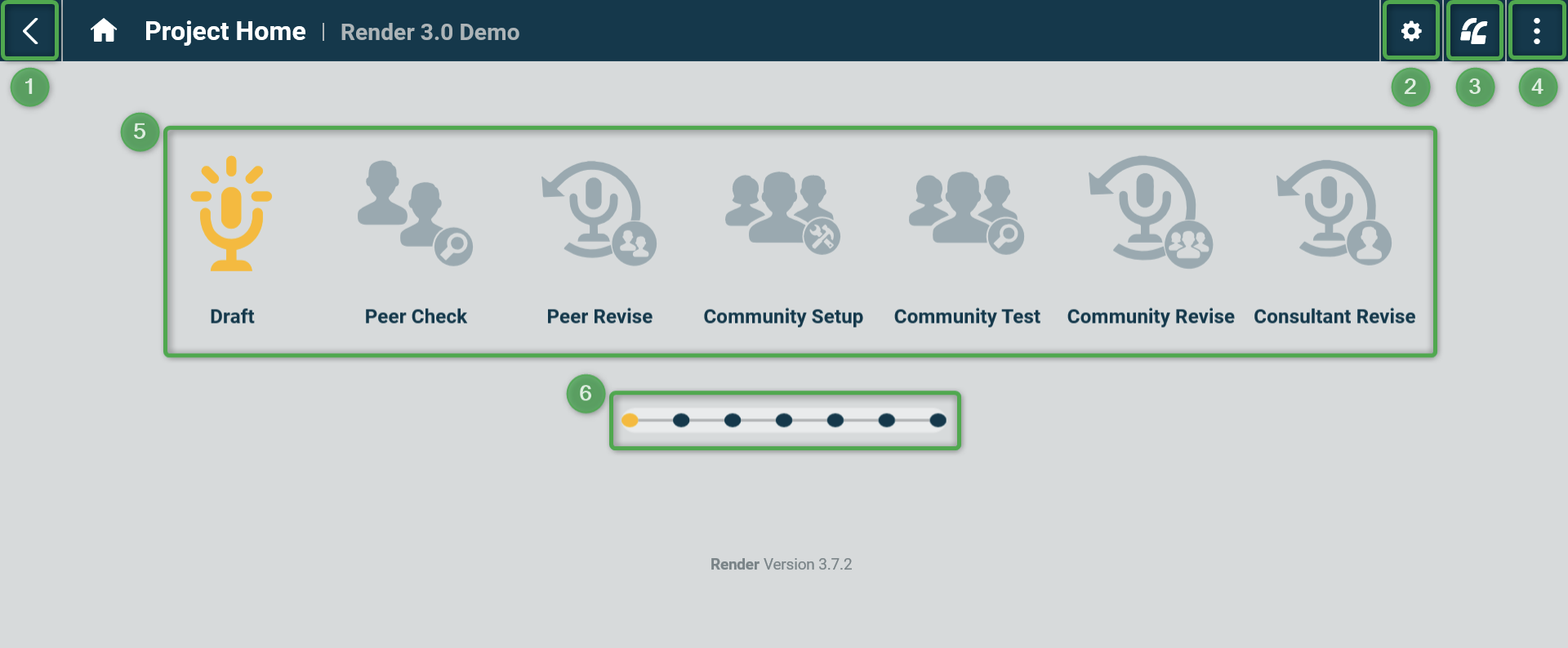 On the top bar in Render you will always see a Back button (1) on the upper left hand corner. You can click back at any time to go back one page (if possible) or back to your Home page. You can change your user settings by clicking the Settings button (2). Click the Home button (3) to go back to the Project Home (3) page with all of your assignments. See the User Menu (4) for more information on your user and your project. The roles assigned to you (5) will appear in Project Home. You may not be assigned all of the roles shown here. Yellow roles means there is work for you to do. Blue roles mean you can go in and see your work, but there is nothing new for you to do. Gray roles means there is no work there. Move the scroll bar (6) back and forth to show roles not currently visible. Each dot in the scroll bar maps directly to a role image.