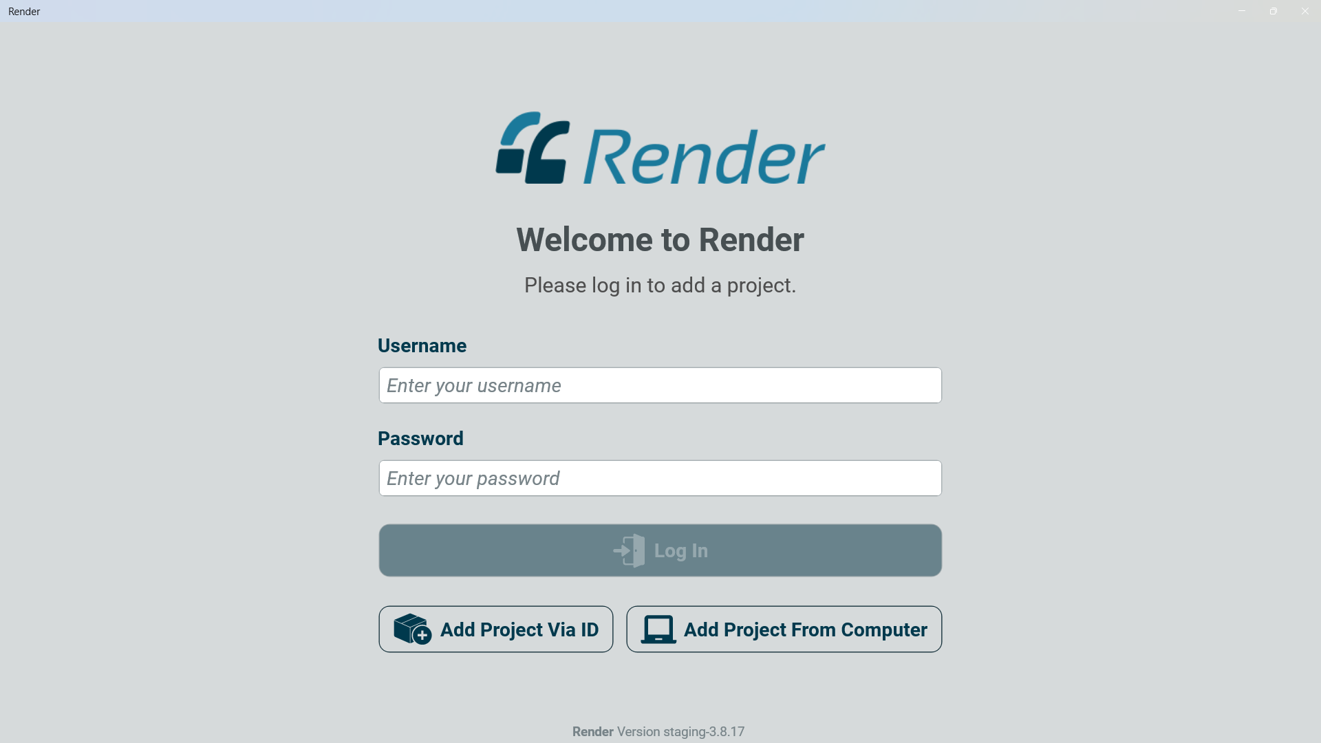 When you open Render, you will have to put in your username and password. If you have the Configure role, you will also have to create other users for the project on the first time you log in. Your login page will look something like this: