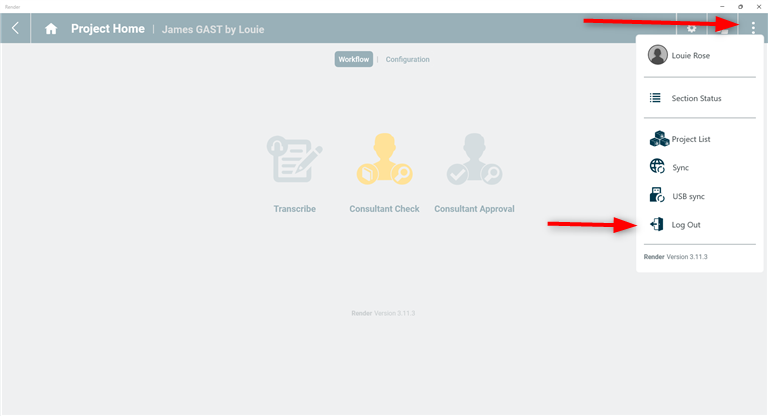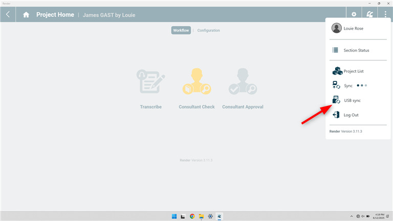 On each remaining project computer, connect it to the router and open Render. Log in as the Config person. Then open the 3-dot menu. You will see the LAN sync spinner spinning.