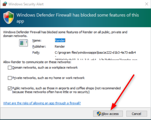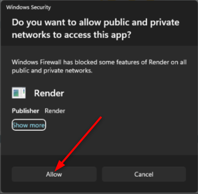 You will now see a Windows Security screen. Click Allow. DO NOT CLICK CANCEL! UPDATE: Render 3.12 manages the Windows Firewall settings automatically so you likely will not see this popup if you are running Render 3.12 or higher.