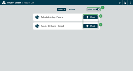 Saat Tombol Bongkar Data (1) diaktifkan, tombol Bongkar (2) akan muncul. Tekan tombol ini untuk membongkar proyek dari daftar proyek anda. Tidak ada yang akan dihapus karena semua data proyek yang telah disinkronkan akan disimpan, namun proyek tidak lagi akan terlihat di perangkat anda saat melihat Daftar Proyek. Untuk menambahkannya lagi, kembali ke halaman Tambah Baru.