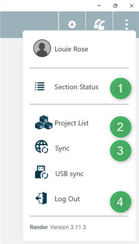 3. Sinkronisasi: Dengan mengeklik sinkronisasi, proses akan dimulai, yang akan membagikan berkas Anda dengan semua orang lain dalam proyek. Proses ini akan disinkronkan ke web jika komputer memiliki koneksi internet. Jika komputer tidak memiliki koneksi internet tetapi terhubung, bersama dengan komputer proyek lainnya, ke router, maka proses akan disinkronkan langsung ke komputer lain tersebut. Ini dikenal sebagai sinkronisasi LAN. Terakhir, jika ada flash drive USB yang terhubung ke komputer, Anda akan melihat opsi sinkronisasi 'USB' untuk menyinkronkan berkas proyek ke flash drive tersebut. Render 3 dirancang untuk melakukan sinkronisasi secara otomatis dan sering saat program terbuka. Namun, sangat disarankan agar tim melakukan sinkronisasi secara manual saat pertama kali memulai pekerjaan mereka, dan kemudian lagi sebelum sesi kerja berakhir..