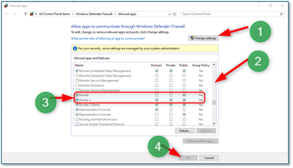 Dalam tetingkap Keselamatan Windows, klik/ketik pada “Tukar tetapan” (1). Kemudian tatal ke bawah (2) sehingga anda melihat baris berlabel "Render" dan "Render 3" (3). Mungkin terdapat lebih daripada satu baris baris "Render". Pastikan SEMUA ini dibenarkan (dengan tanda semak dalam kotak (3). Setelah semua ini Dibenarkan, klik/ketik “OK” (4).